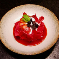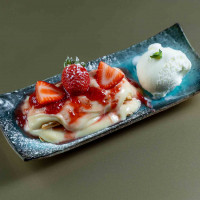 Massa chinesa, frutas vermelhas, creme brûlée, chantilly, finalizado com calda de frutas vermelhas.