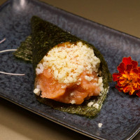 Arroz japonês, nori, tartar de salmão, finalizado com crispy tempura.