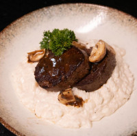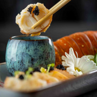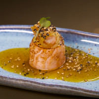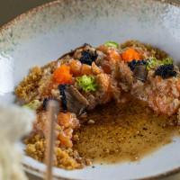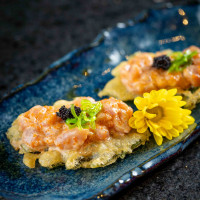 Salmão picado na ponta da faca, raspas de limão siciliano, mix de cogumelos, mel trufado, hondashi, ovas tobiko black, ovas de massago, folhas de arroz e molho trufado.