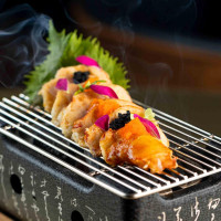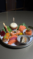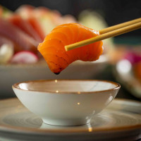 Arroz japonês, lâminas de barriga de salmão finalizadas com shoyu, sal rosa, raspas de limão siciliano e azeite trufado.