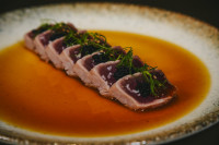 Lâminas de polvo, finalizadas com molho chimichurri, shoyu e sal rosa.