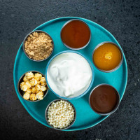 Gelato de creme, acompanhado por porções de: calda de caramelo, calda de chocolate, calda de maracujá, pipoca caramelizada, paçoca e crocante de leite.