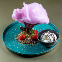 Árvore de chocolate com cobertura de algodão doce, brigadeiro de colher, farofa de castanhas e gelato de creme.