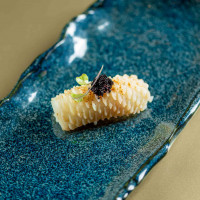 Arroz japonês, lâminas de lula finalizadas com shoyu, sal rosa, manteiga, pimenta togarashi e ovas tobiko black.