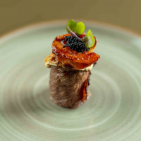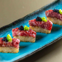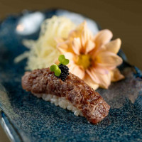 Arroz japonês, lâminas de wagyu finalizadas com foie gras, shoyu, sal rosa, mel trufado e ovas tobiko black. (NÃO INCLUSO )