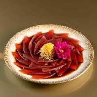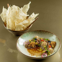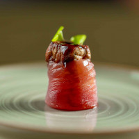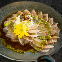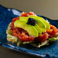 Atum picado na ponta da faca, pimenta sweet chilli, cebola roxa, coentro, hondashi, ovas tobiko black, ovas de massago, avocado e patê de vieira canadense, regado com molho ponzu. Acompanha folhas de arroz.