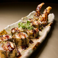 Arroz japonês, nori, camarão tempura, cream cheese, finalizado com lâminas de salmão, raspas de limão taiti e molho tarê.