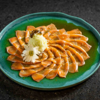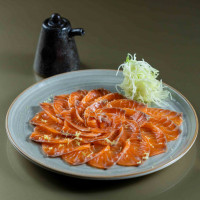 Finas lâminas de salmão, finalizadas com molho shoyu, limão, sal rosa e azeite de oliva.