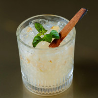 Gin importado, xarope Monin de lichia, suco de limão siciliano, folhas de manjericão, canela em pau e água tônica.