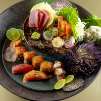 7 lâminas de salmão, finalizado com manteiga, shoyu, limão, ovas massago, cogumelos e quinoa frita.