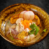 Cubos de peixe branco marinados no leite de tigre, cebola roxa, coentro, flor de sal, pimenta togarashi, ovas de massago, quinoa frita, banana da terra frita, finalizado com mel de maracujá.