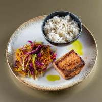 Lombo de salmão grelhado na chapa. Acompanha legumes, chari ou arroz branco