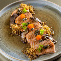 5 lâminas de atum selados com gergelim, finalizados com mix de cogumelos, mel trufado e alho poro frito.