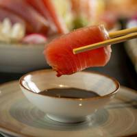 Arroz japonês, lâminas de atum finalizadas com molho de alho poro, sal rosa e shoyu.
