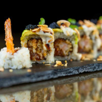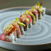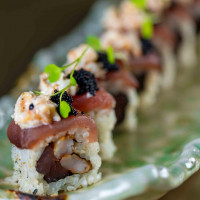 Arroz japonês, nori, camarão empanado, siri, finalizado com lâminas de avocado, atum e patê de vieira.