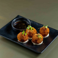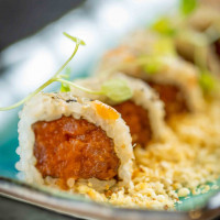 Bolinho de arroz recheado com camarão ou salmão, maionese spacy, raspa de limão taiti, nori finalizado com gergilim.
