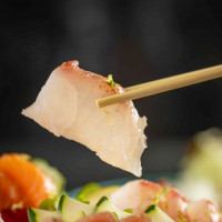 Arroz japonês, lâminas de peixe branco finalizadas com shoyu, sal rosa e raspas de limão taiti.