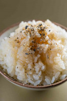 Arroz japonês, lâminas de camarão finalizadas com shoyu, sal rosa e pimenta layu.