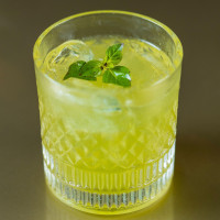 Jack de maçã verde, limão siciliano, xarope de açúcar e um ramo de folha de hortelã.
